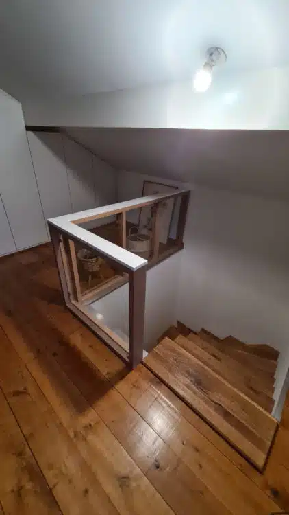 Création d’une rambarde originale mélant bois et verre. Travaux réalisés à Maisons Laffitte.